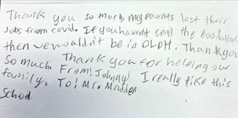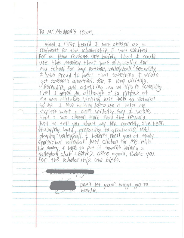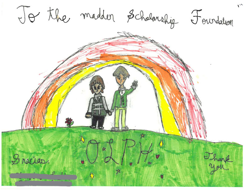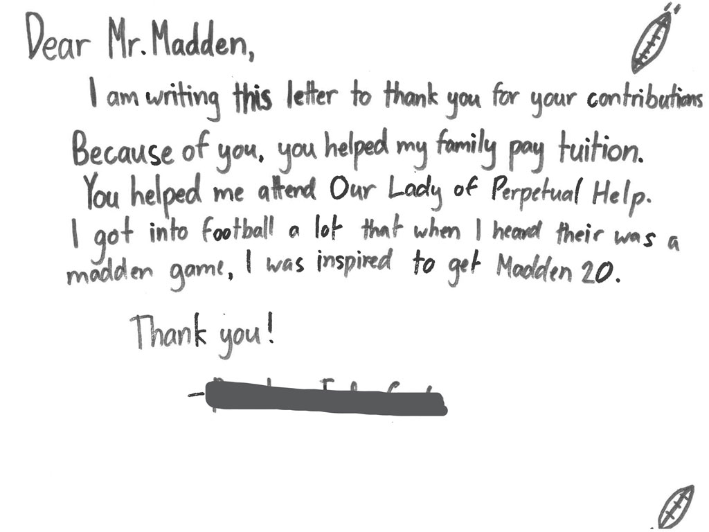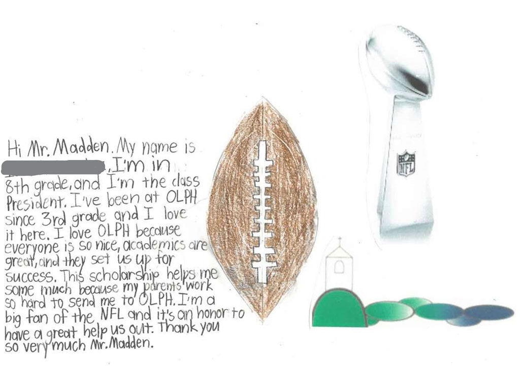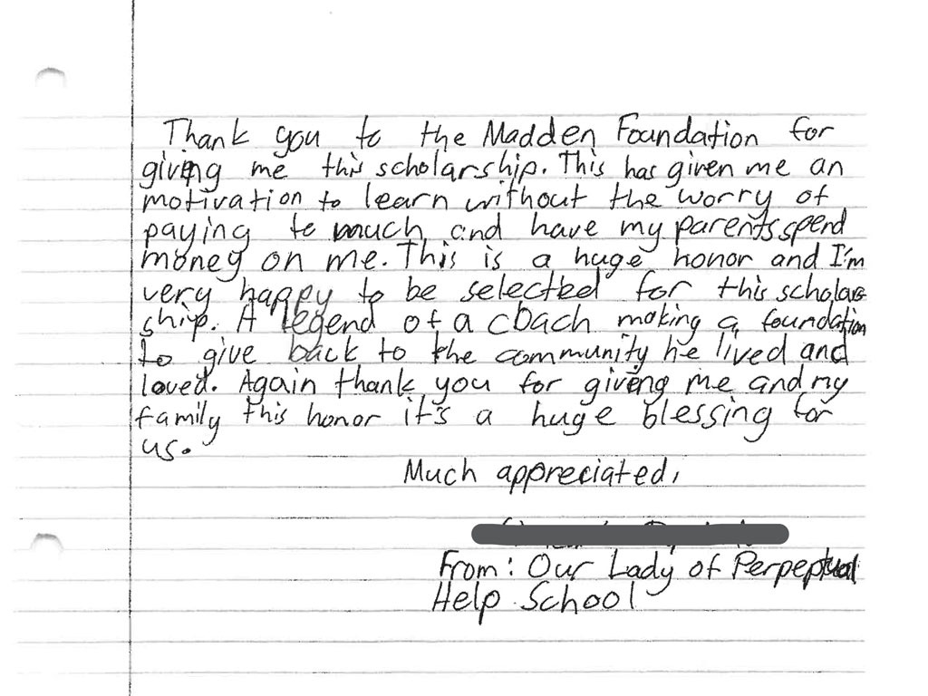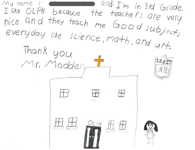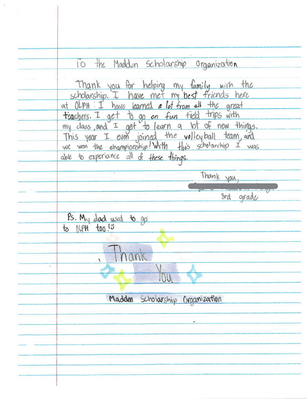 Madden Charities is proud to support Our Lady of Perpetual Help where John Madden attended Elementary school. We provide scholarships for young students and their families, many of whom could not attend without our assistance. In return, we receive annual thank you letters from the students at OLPH, sharing what our support means to them. We hope you enjoy reading some of the heartfelt thank you notes below!